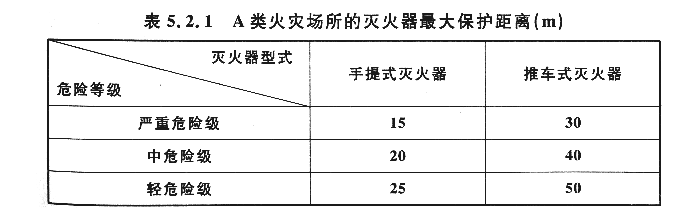 設置在A類火災場所的滅火器,其最大保護距離應符合表5.2.1的規(guī)定。
