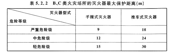 設置在B、C類火災場所的滅火器,其最大保護距離應符合表5.2.2的規(guī)定。