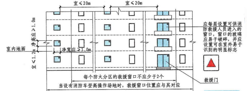 3、每個(gè)防火分區(qū)的救援窗口不應(yīng)少于2個(gè),當(dāng)設(shè)有消防車登高操作場(chǎng)地時(shí),救援窗口位置應(yīng)與其對(duì)應(yīng)。